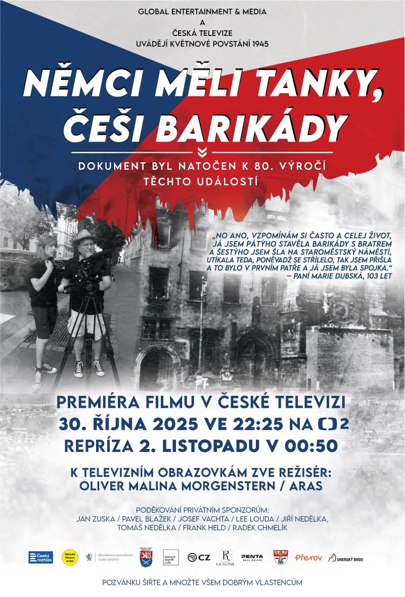 Milí přátelé, Ti z Vás, kteří neměli možnost navštívit promítání dokumentárního filmu režiséra Olivera Morgensterna o Pražském povstání v květnu 1945 "Němci měli tanky, Češi barikády", mohou ho zhlédnout na ČT2 ve čtvrtek 30. října 2025 od 22:25 hod. nebo v neděli 2. listopadu 2025 od 00:50 hod.