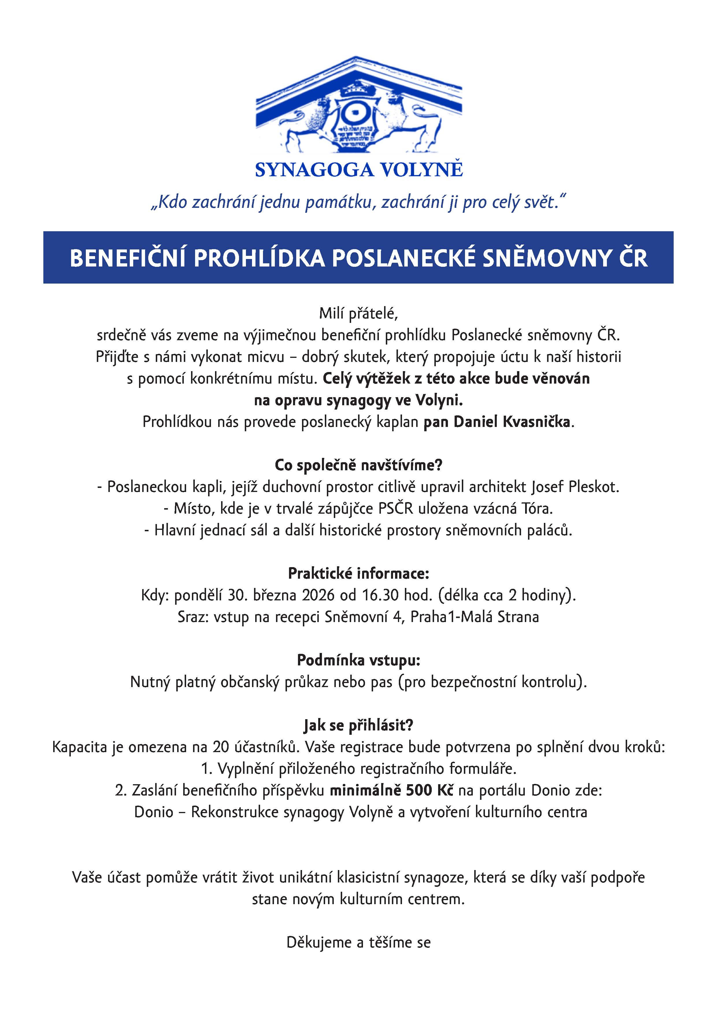 Synagoga Volyně Vás zve na benefiční prohlídku Poslanecké sněmovny ČR, a to v pondělí 30. března 2026, od 16:30 hod., sraz: Sněmovní 4, Praha 1 - Malá Strana.
