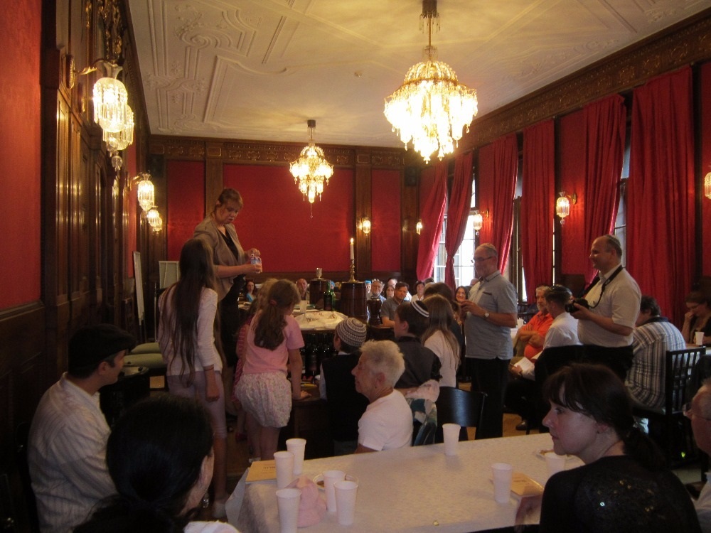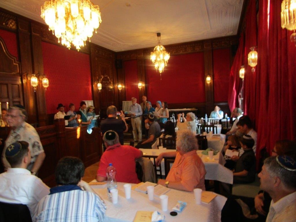 Ve společenské části oslavy Šavuot nás čekalo izraelské košer víno a mléčné občerstvení, které pro nás připravila košer jídelna DSP Hagibor. Mléčná jídla se jedí o Šavuot proto, že Tóra je jako mléko a med. Také číselná hodnota slova חלב mléko je 40 (8+30+2), jako počet dní, které strávil Mojžíš na Sinaji, když přijímal Tóru.