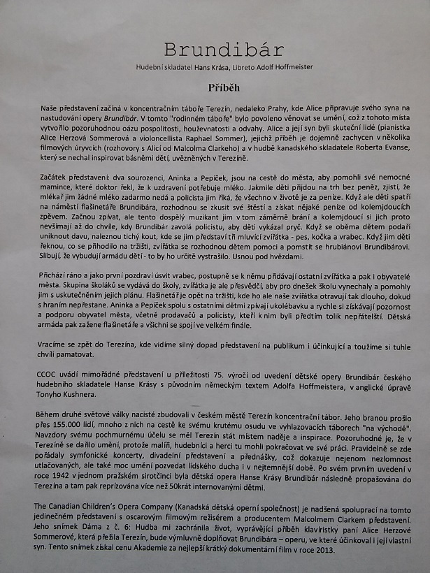 Vážení a milí přátelé, náš vzácný přítel, narozený v Českých Budějovicích, přeživší Terezín a Osvětim, člen ŽLU John Freund z Toronta, navštívil Prahu se svými dvěma vnoučaty a se skupinou 50 dětí včetně vedoucích z Canadian Children’s Opera Company. V Divadle ve Dlouhé v úterý 4. července 2017 od 19:30 hodin tyto děti vynikajícím a dojemným způsobem sehrály terezínskou operu Hanse Krásy „Brundibár“. Představení probíhalo v anglickém jazyce, dvě písně však děti zazpívaly česky. Píseň „Maminka“ si můžete poslechnout z videa, které si lze stáhnout: zde /heslo Brun17/.