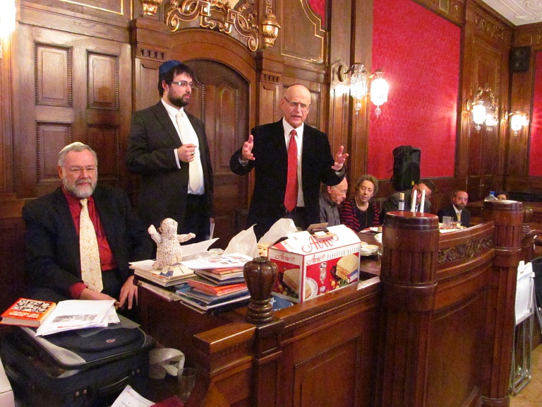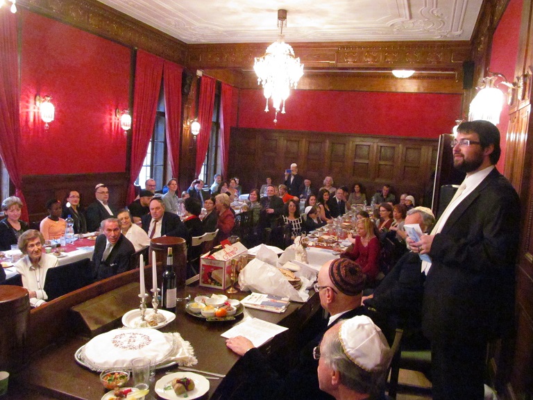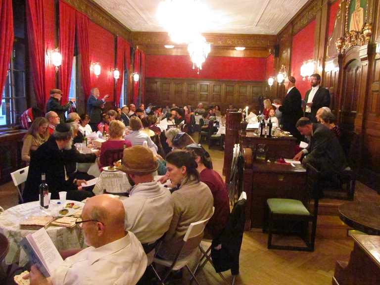 Vážení a milí přátelé, letošní první sederová večeře svátku Pesach spojená s oslavou Šabatu, kterou ŽLU pořádala v pátek 3. dubna 2015 od 18:00 hodin ve společenském sále ve 3. patře Židovské radnice v Maiselově 18, byla opravdu mimořádná. Rozhodli jsme se vycházet ze židovské tradice, že se nemají odmítat zájemci o účast na Sederu… Jaké to mělo následky – v sále radnice, kde je 55 židlí, se nás sešlo 107! Počítali jsme s tím a včas v obchodu IKEA dokoupili 52 skládacích židlí a dopravili je do sálu ve 3. patře. Měli jsme též domluveno, že v kavárně na galerii v 1. patře, kde jsme měli uloženo zakoupené košer víno, si také půjčíme 6 dalších stolků. Žel dlouho trvalo, než jsme přesvědčili ostrahu ŽO, aby nám kavárnu otevřela.