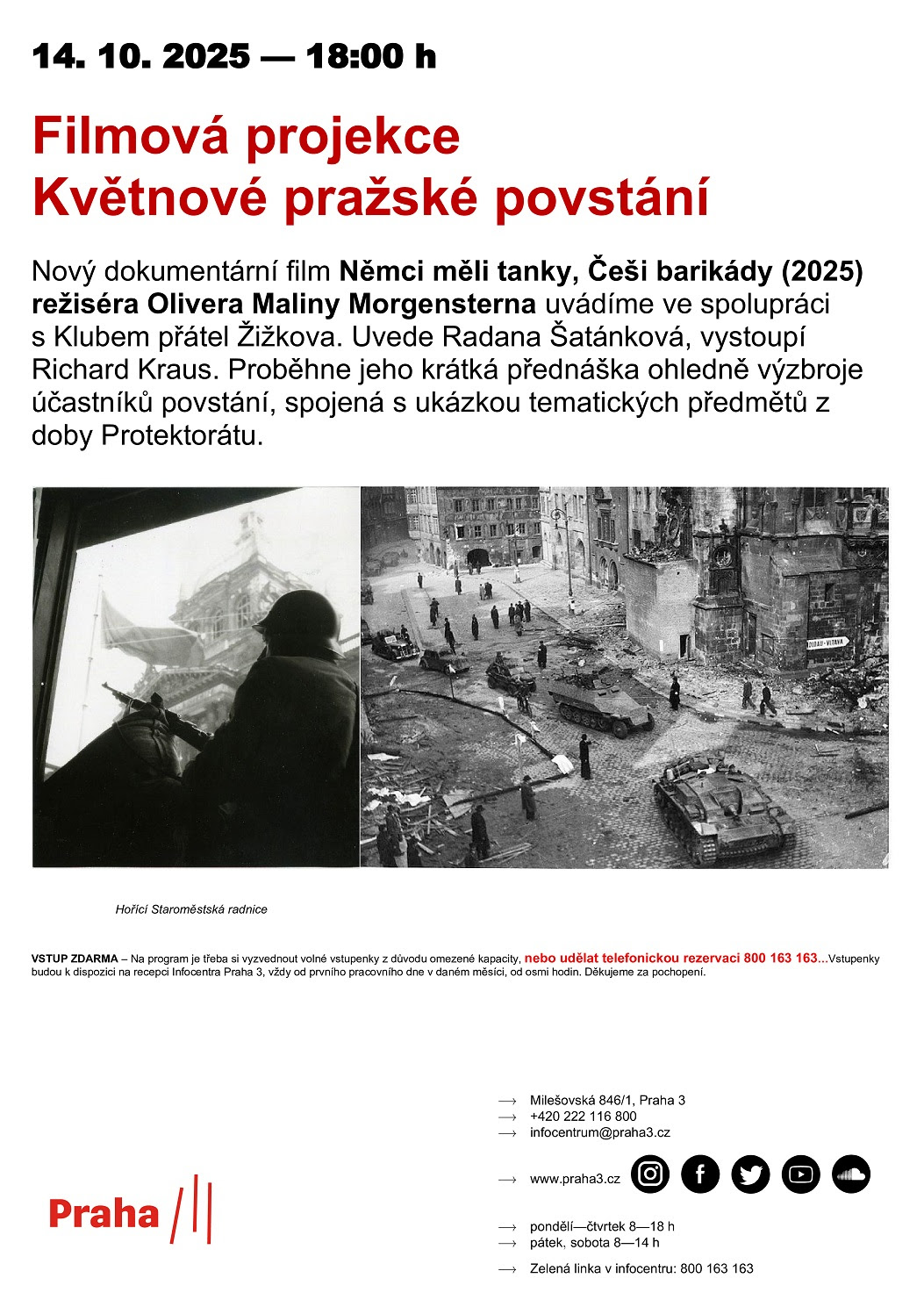 Vážení a milí přátelé, režísér Oliver Morgenstern, člen ŽLU, zve ty z Vás, kteří jste 3. září nestihli promítání jeho nového filmu o Pražském povstání v květnu 1945 "Němci měli tanky, Češi barikády", na další promítání, které se bude konat v úterý 14. října 2025 od 18 hod. v Infocentru, Milešovská 846/1, Praha 3. Jde o celovečerní dokumentární film o zásadních událostech Pražského povstání od 5. do 11. května. Letos v květnu jsme si připomněli kulaté výročí, k němuž byl připraven tento film přinášející vzpomínky posledních žijících pamětníků, kteří neváhali a na barikádách se postavili německým okupantům. Po filmu bude následovat beseda s režisérem Oliverem Morgensternem. VSTUP ZDARMA, na program je však třeba si včas vyzvednout volné vstupenky z důvodu omezené kapacity sálu, nebo udělat telefonickou rezervaci na 800 163 163.