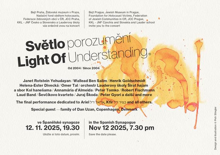 Milí přátelé, Bejt Praha, Židovské muzeum v Praze, Nadační fond obětem holocaustu, Federace židovských obcí v ČR, JCC Praha, KKL - JNF Česko a Slovensko a Lauderovy školy srdečně zvou na koncert Světlo porozumění ve Španělské synagoze ve středu 12. listopadu 2025 v 19:30 hod. Z bezpečnostních důvodů bude vstup umožněn pouze registrovaným.