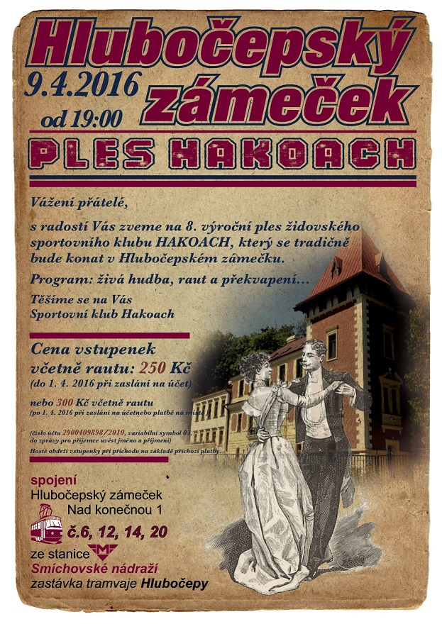Milí přátelé, v sobotu 9. dubna 2016 večer se na Hlubočepském zámečku konal už tradiční ples židovského sportovního klubu Hakoach, na který dostala pozvání i ŽLU. V přátelské a veselé atmosféře se tam sešli lidé z mnoha židovských spolků a jejich přátelé. Děkujeme především předsedkyni Hakoach Zuzaně Jančaříkové za pečlivou organizaci a panu Juraji Pickovi, majiteli Hlubočepského zámečku, za podporu a bezplatné poskytnutí prostor pro ples. V úvodu vystoupila taneční skupina Karamelka s ukázkou stepu a kankánu. K tanci nám pak výborně hrála a zpívala hudební skupina Firmus Praha pod vedením kapelníka Bohumila Šebka. Izraelské kolové tance nás trpělivě učil Ondřej Novák.