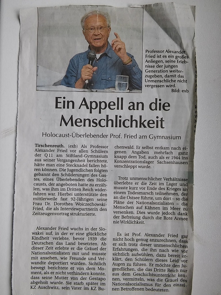 Srdečně blahopřejeme našemu vzácnému příteli, panu Prof. Alexandru Nesanelu Friedovi, který dne 7. května 2017 oslaví 92. narozeniny! Před 72 lety dne 3. května 1945 byl osvobozen z pochodu smrti. Velice obdivujeme stálý životní elán, optimismus, lidskou empatii a hluboké znalosti pana profesora. Těšíme se na každé další setkání s ním, na jeho nenahraditelné vzpomínky a úvahy. Přejeme mu pevné zdraví, hodně štěstí, lásky a radosti ze života. Ad mea veesrim šana! Osobní gratulace zasílejte přímo na jeho adresu: Tato e-mailová adresa je chráněna před spamboty. Pro její zobrazení musíte mít povolen Javascript.
