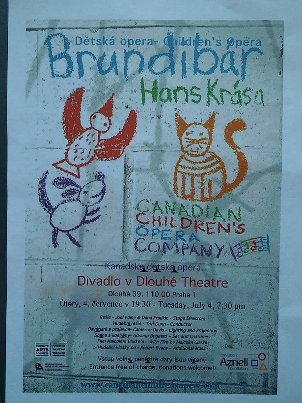 Vážení a milí přátelé, náš vzácný přítel, narozený v Českých Budějovicích, přeživší Terezín a Osvětim, člen ŽLU John Freund z Toronta, navštívil Prahu se svými dvěma vnoučaty a se skupinou 50 dětí včetně vedoucích z Canadian Children’s Opera Company. V Divadle ve Dlouhé v úterý 4. července 2017 od 19:30 hodin tyto děti vynikajícím a dojemným způsobem sehrály terezínskou operu Hanse Krásy „Brundibár“. Představení probíhalo v anglickém jazyce, dvě písně však děti zazpívaly česky. Píseň „Maminka“ si můžete poslechnout z videa, které si lze stáhnout: zde /heslo Brun17/.
