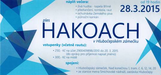 Milí přátelé, po dohodě s nově zvoleným předsedou židovského sportovního klubu Hakoach Lukášem Kyptou, který prohlásil, že "na akcích Hakoach uvidí rád každého člena nebo příznivce ŽLU", Vám předáváme první letošní pozvánku Hakoach, a to na výroční ples tohoto klubu. Stejně tak i představenstvo ŽLU přivítá, když se jejích akcí budou účastnit členové a příznivce klubu Hakoach, jak tomu ostatně v minulosti velmi často bylo, už proto, že lidé z obou organizací jsou dlouholetí přátelé a navíc mnozí jsou členy nebo příznivci obou těchto židovských organizací.