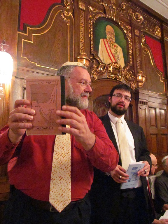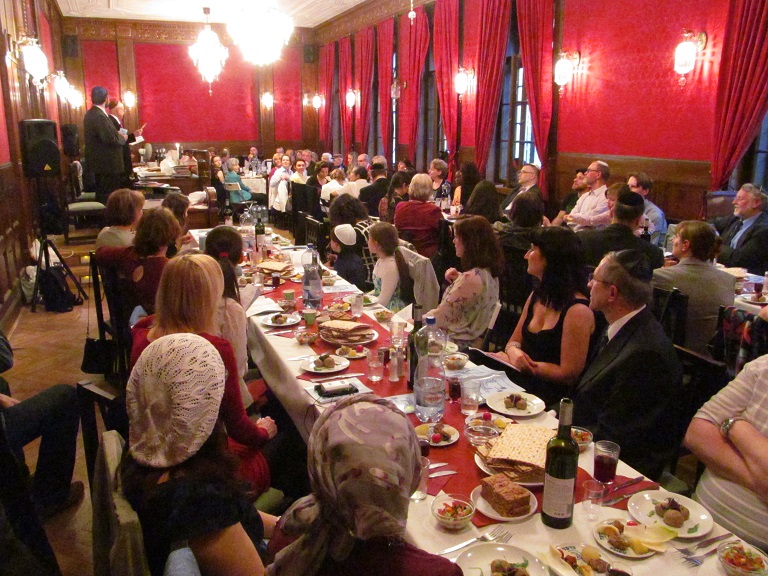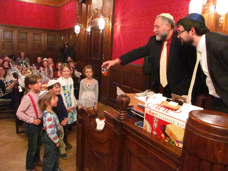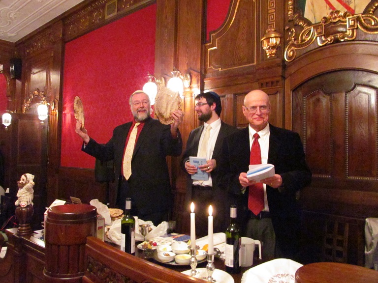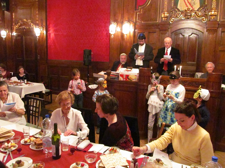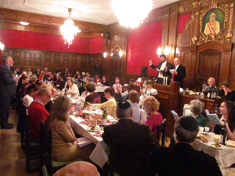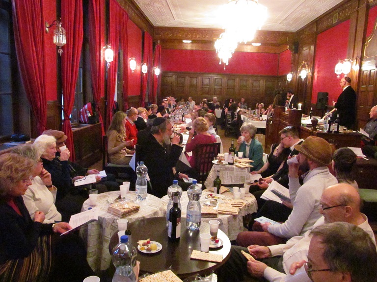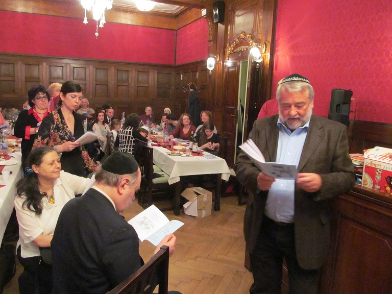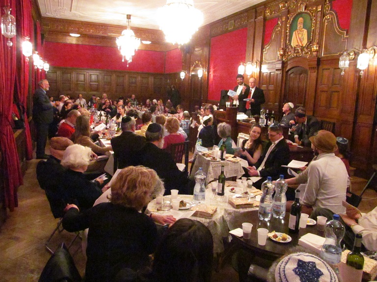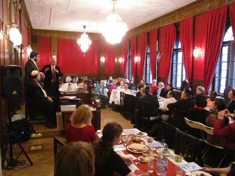 Vážení a milí přátelé, letošní první sederová večeře svátku Pesach spojená s oslavou Šabatu, kterou ŽLU pořádala v pátek 3. dubna 2015 od 18:00 hodin ve společenském sále ve 3. patře Židovské radnice v Maiselově 18, byla opravdu mimořádná. Rozhodli jsme se vycházet ze židovské tradice, že se nemají odmítat zájemci o účast na Sederu… Jaké to mělo následky – v sále radnice, kde je 55 židlí, se nás sešlo 107! Počítali jsme s tím a včas v obchodu IKEA dokoupili 52 skládacích židlí a dopravili je do sálu ve 3. patře. Měli jsme též domluveno, že v kavárně na galerii v 1. patře, kde jsme měli uloženo zakoupené košer víno, si také půjčíme 6 dalších stolků. Žel dlouho trvalo, než jsme přesvědčili ostrahu ŽO, aby nám kavárnu otevřela.