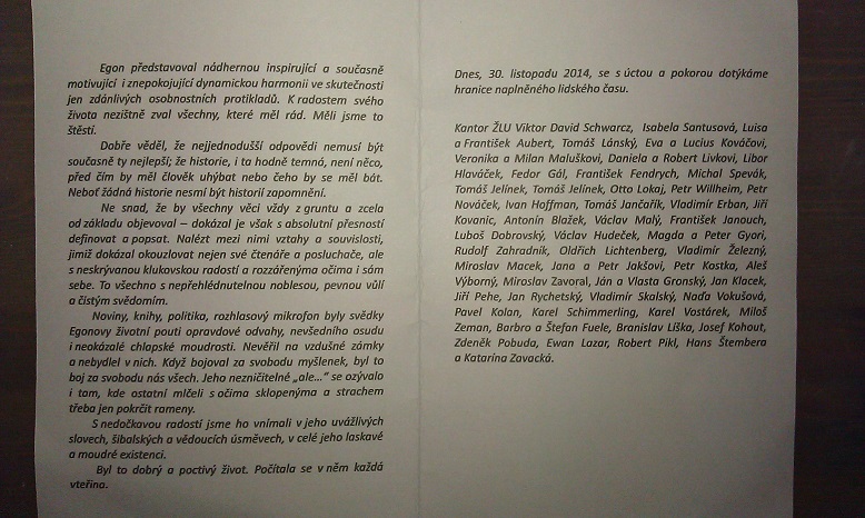 V neděli 30. 11. 2014 v 11:00 hodin jsme se sešli na Novém židovském hřbitově v Praze ke vzpomínce (Jahrzeit) na našeho dobrého přítele pana Egona Theodora Lánského, který zemřel 25. 11. 2013. Pamatujme na něho s úctou, pokorou a požehnáním.